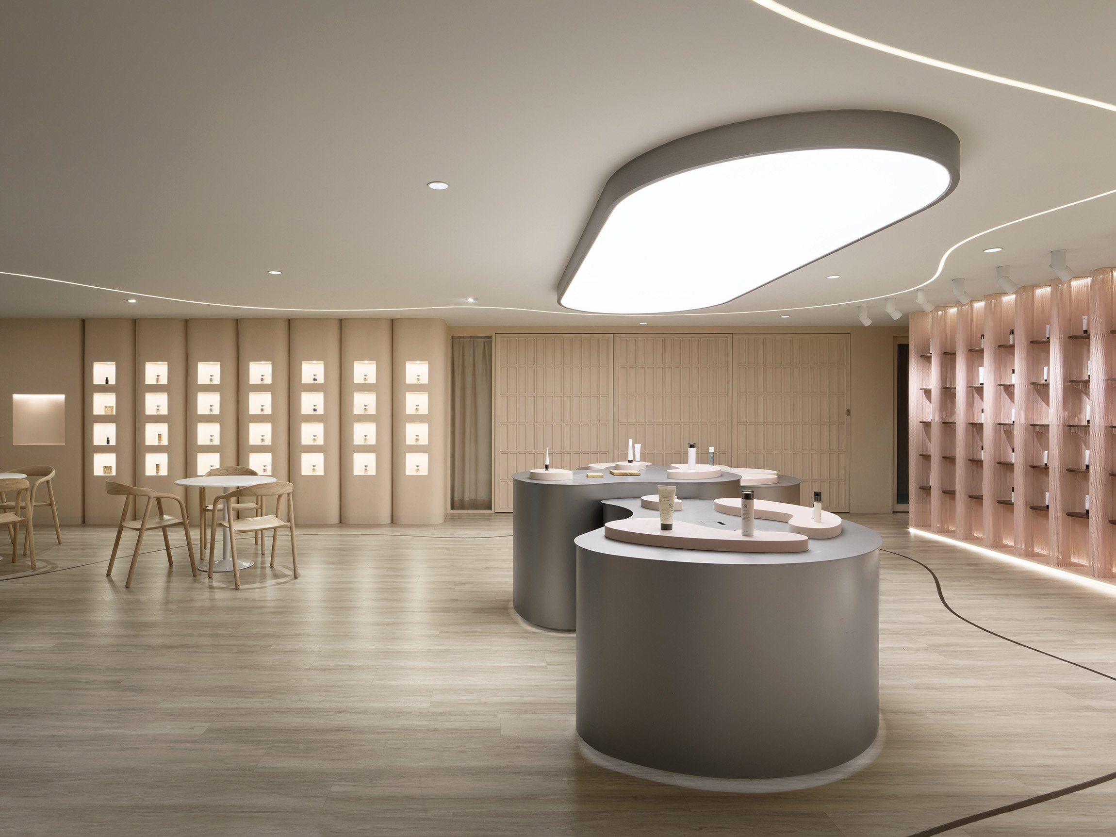 As with a Chinese garden, the spatial experience unfolds as a meandering journey. Customers are guided intuitively through spaces via a wavy brass floor inlay and a matching ceiling light strip — a poetic thread that recalls pathways winding through landscaped courtyards. The design becomes not merely a setting, but an experience of discovery.