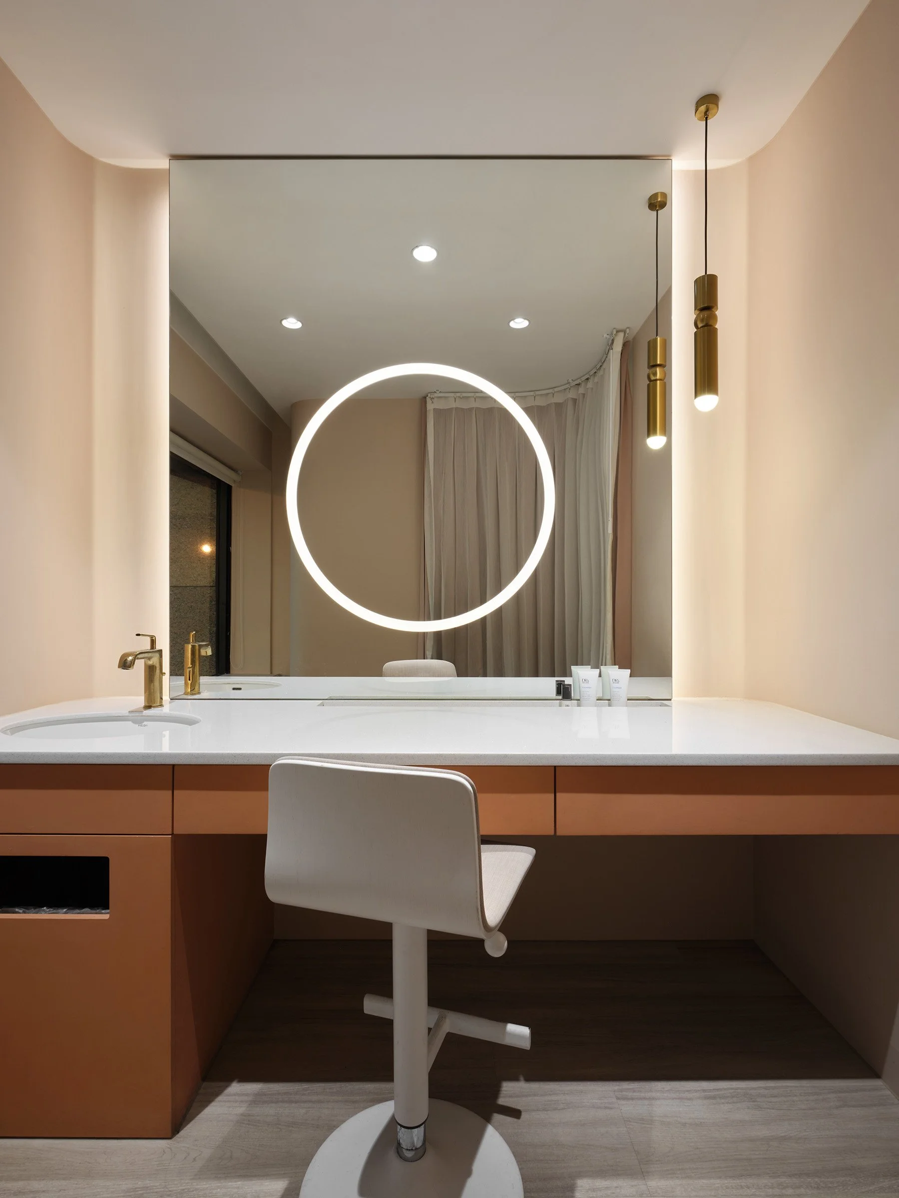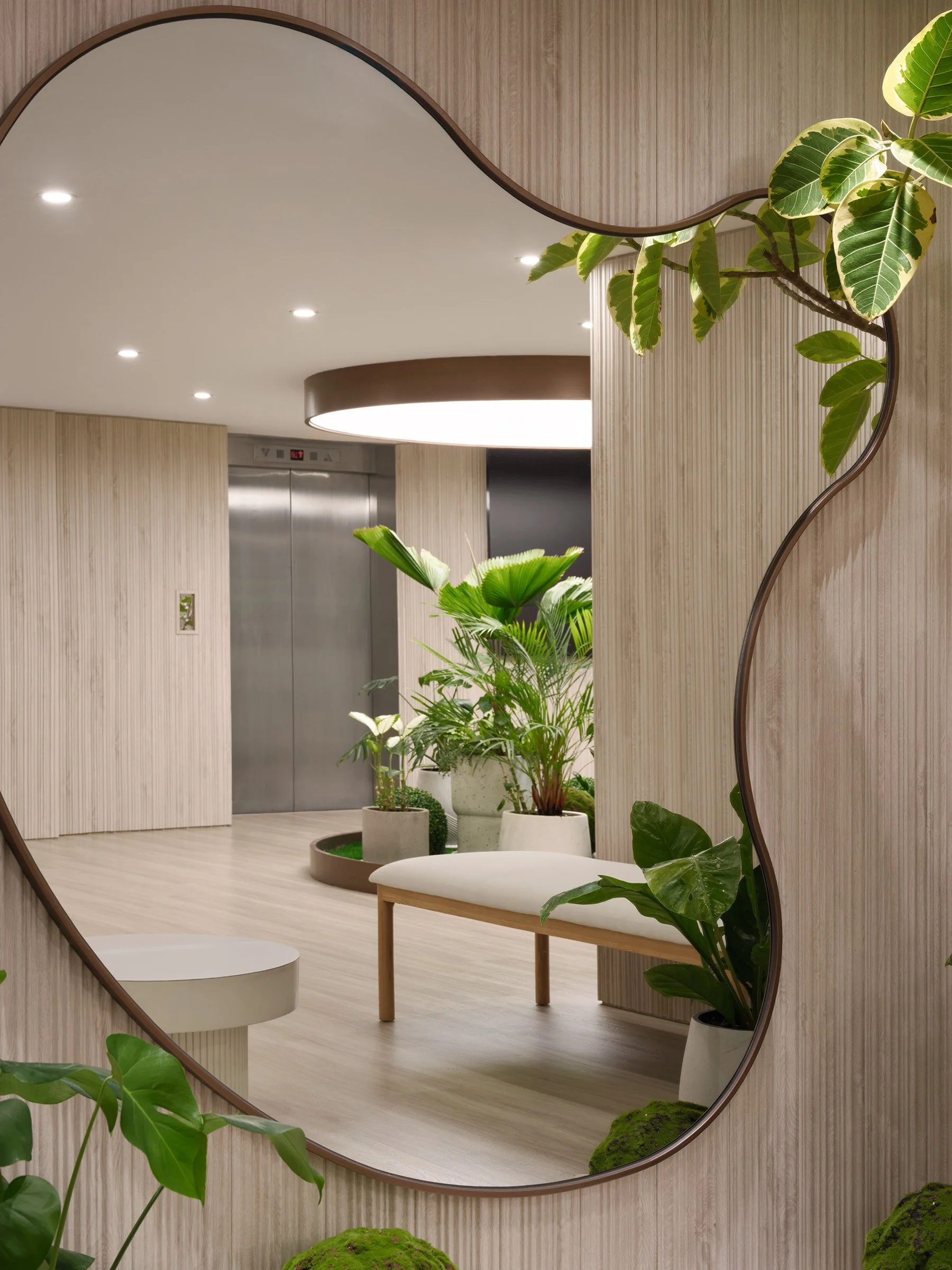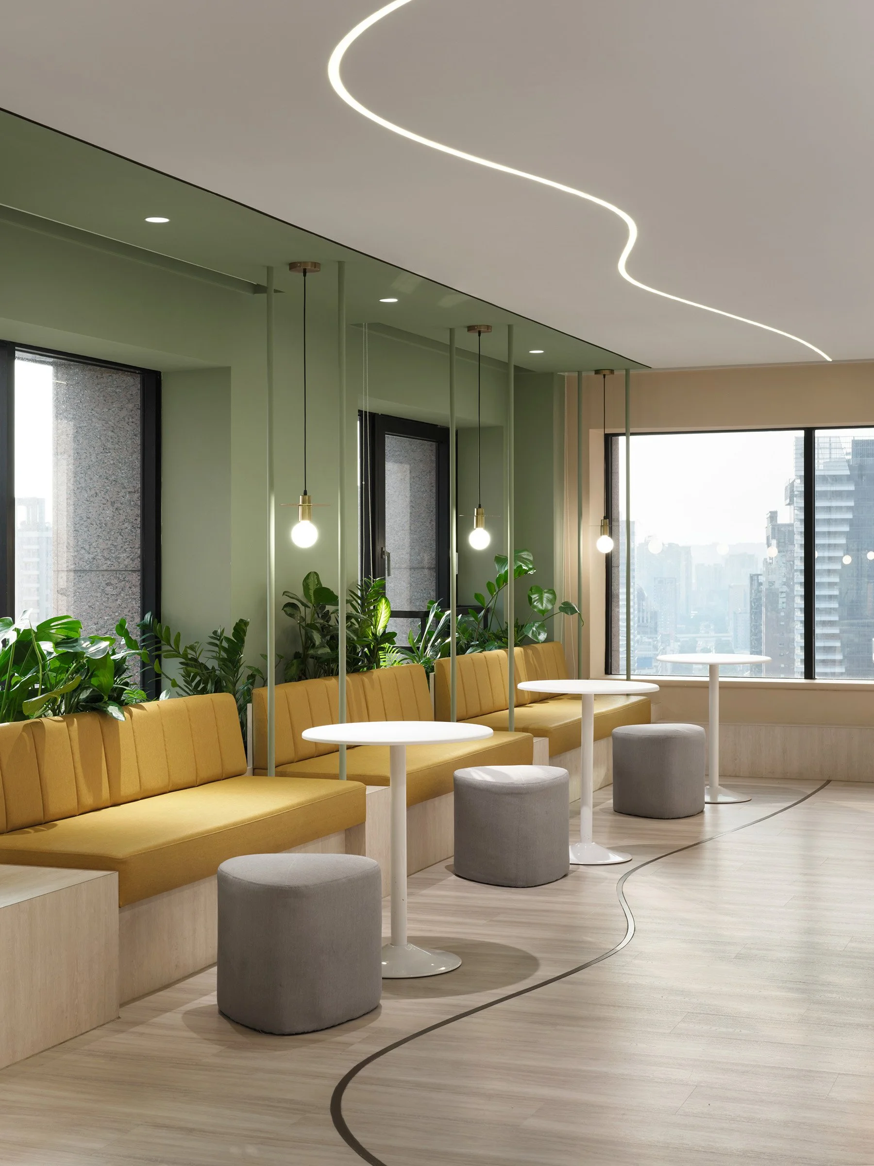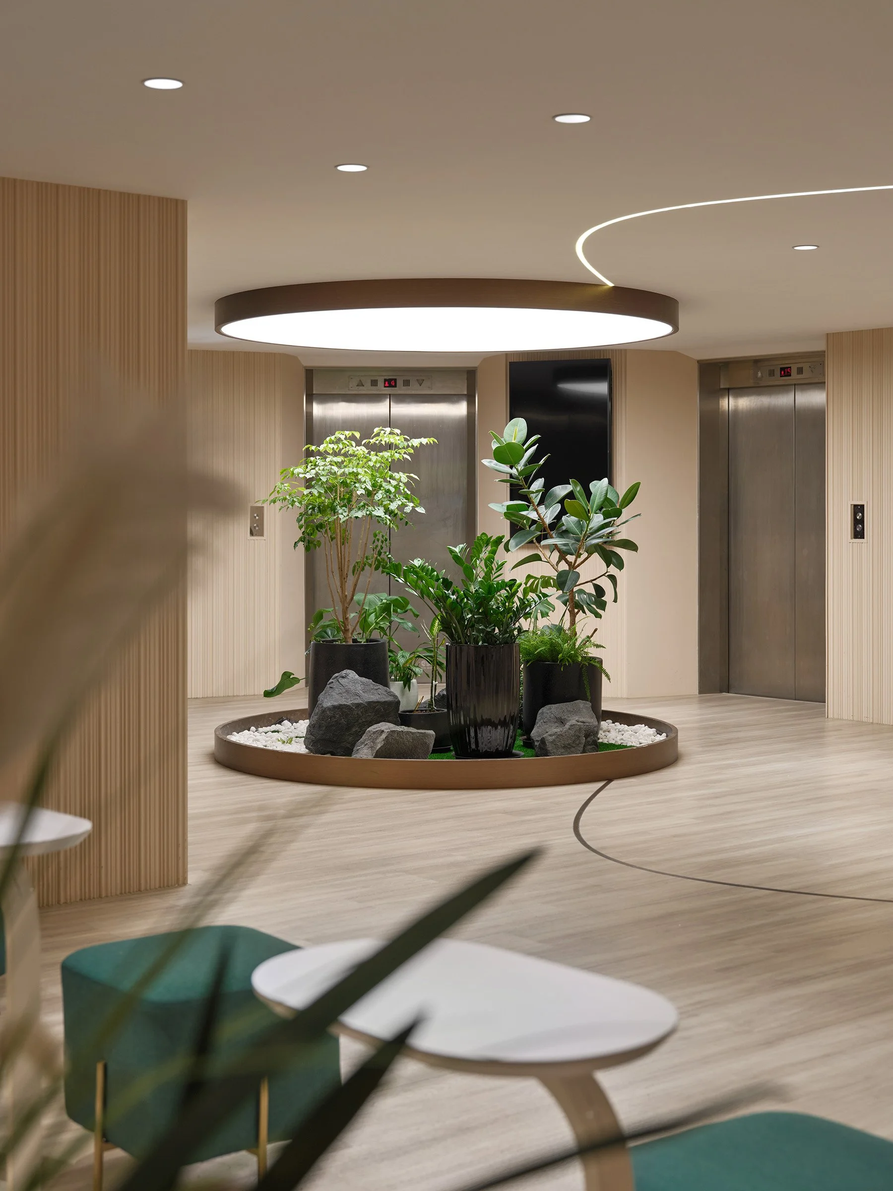 The customer lounge unfurls along the perimeter windows, offering panoramic city views. Integrated into this social setting are an Instagrammable corner with oversized product sculptures, a kid-friendly area for families, and a wellness consultation suite. The journey begins at the lift lobby, where a circular indoor garden with an artificial skylight greets visitors with freshness and calm.