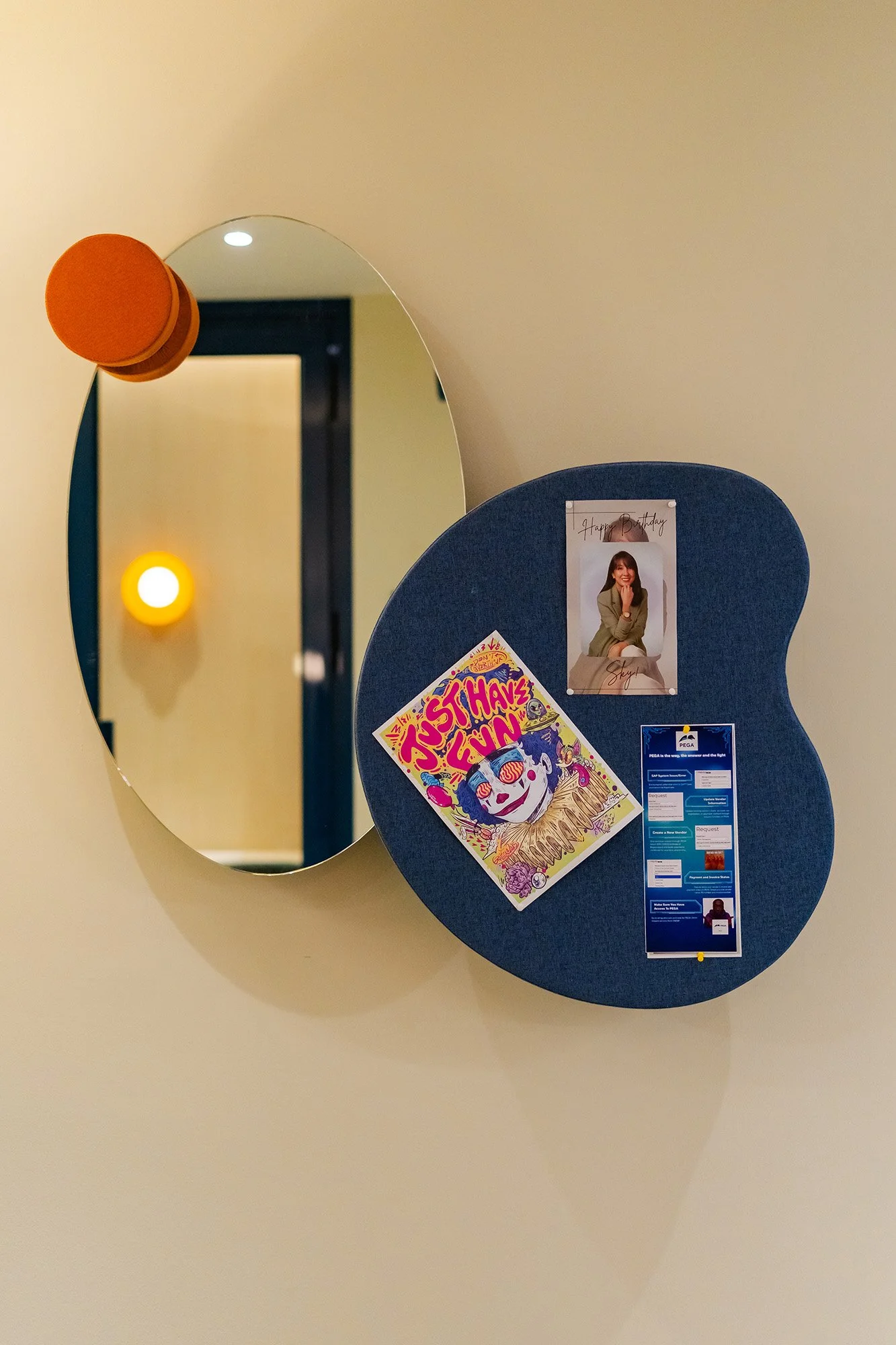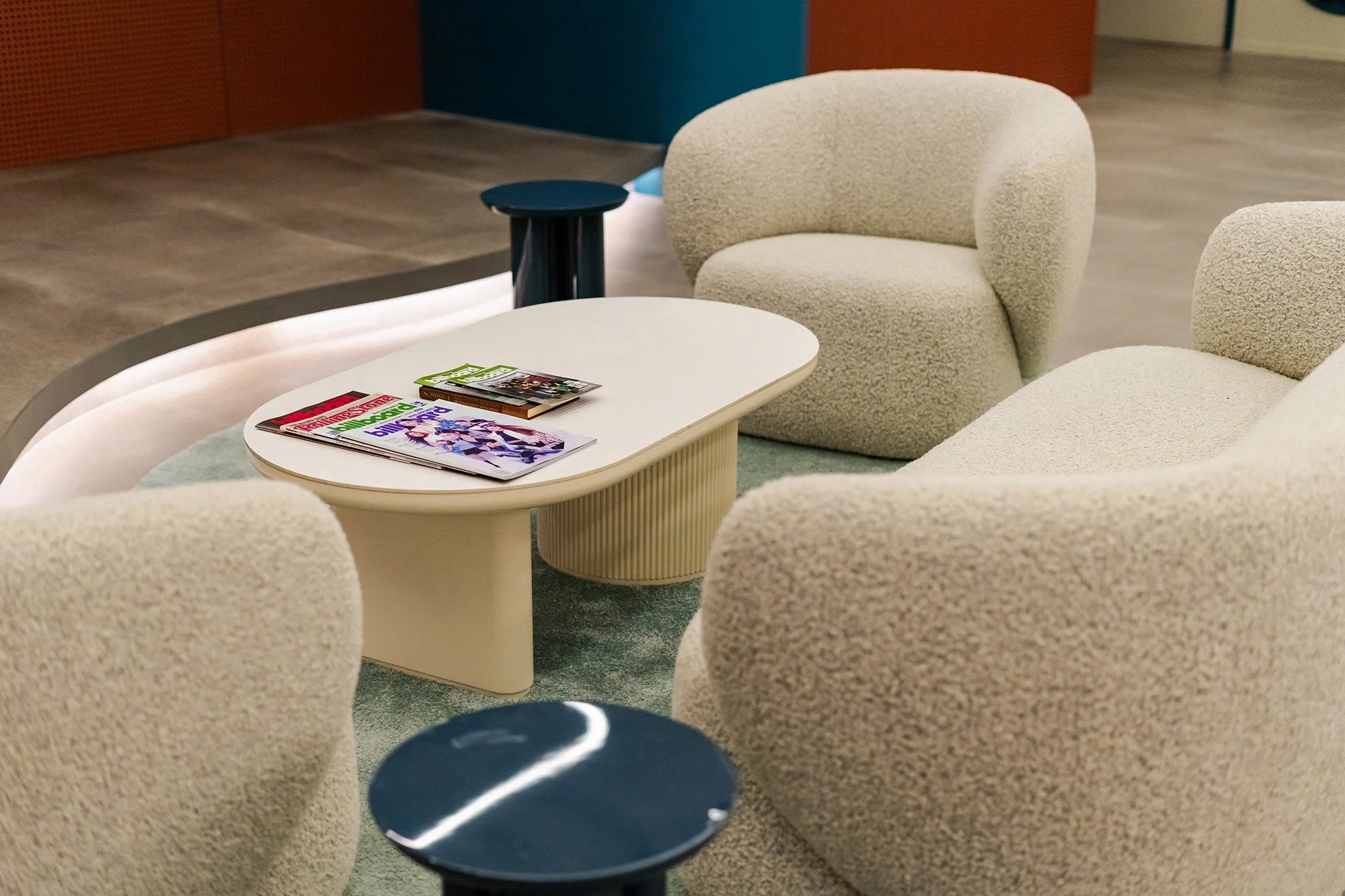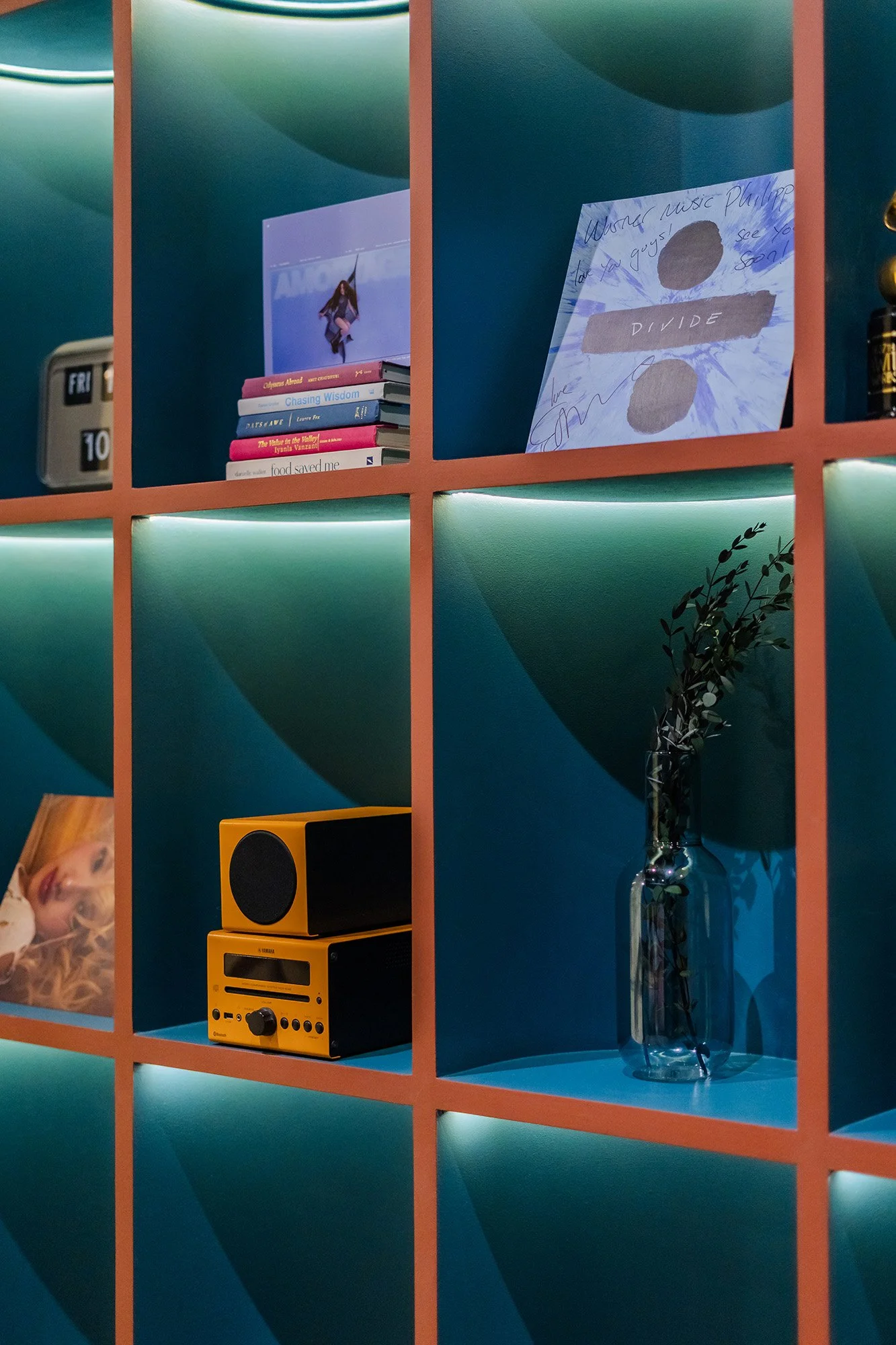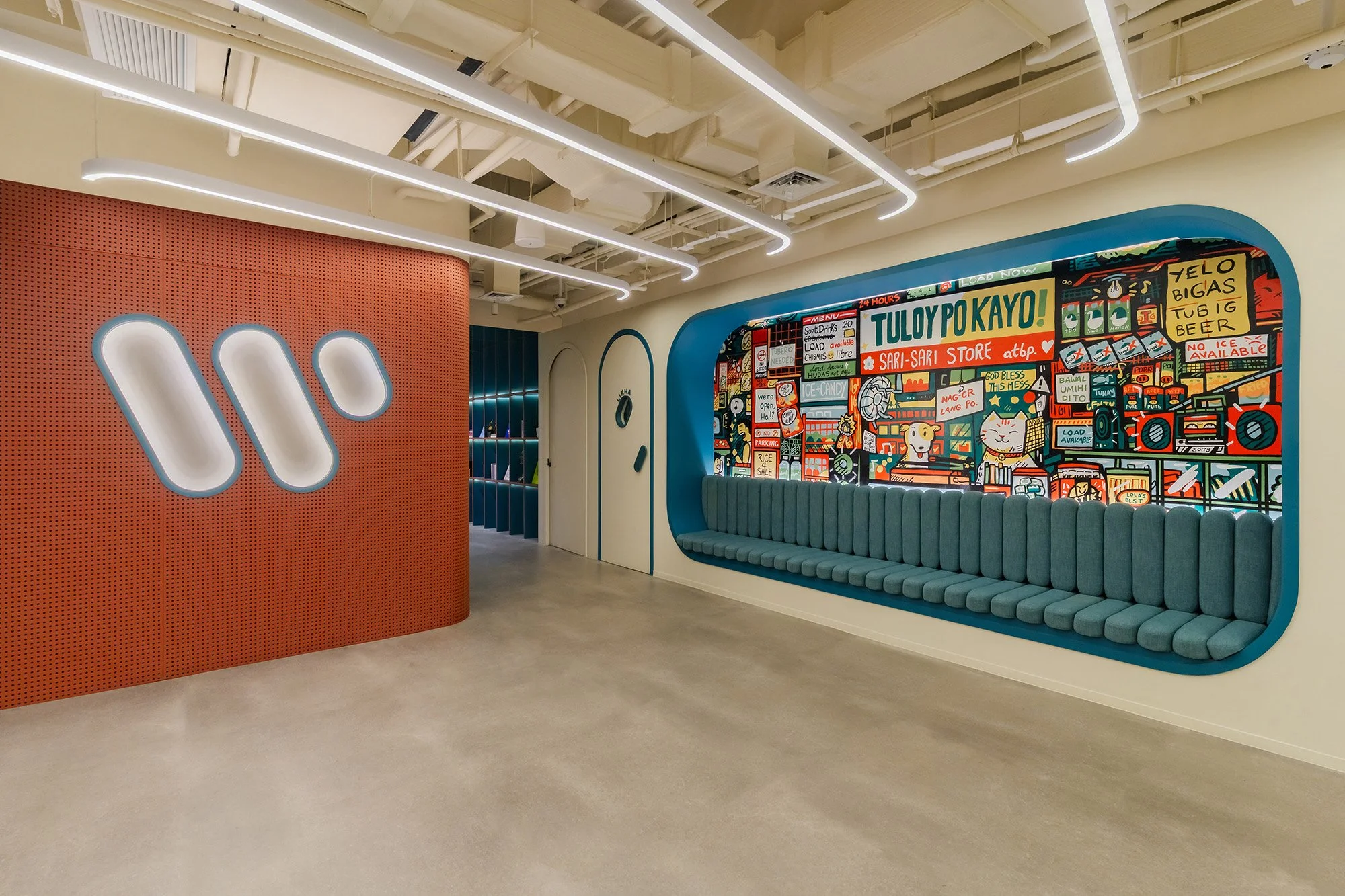 We collaborated with a local artist on a bespoke mural positioned behind a pill-shaped seating niche inspired by the curves of the Warner Music logo. The artwork became the cornerstone of the project’s colour palette—grounded earth tones, energetic reds, sunny yellows, and bold blues—mirroring the vibrancy and diversity of Manila’s cultural and artistic landscape.
