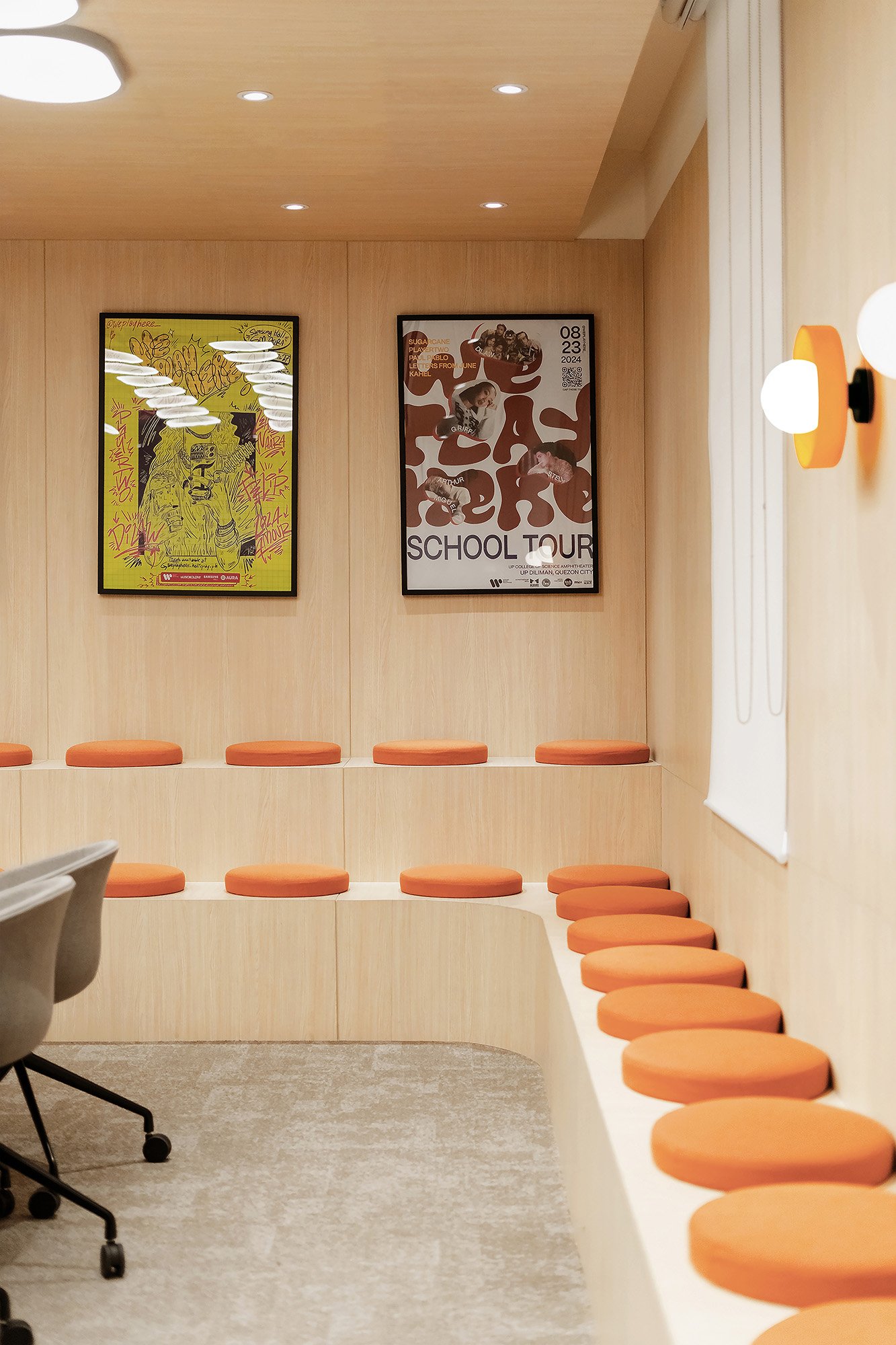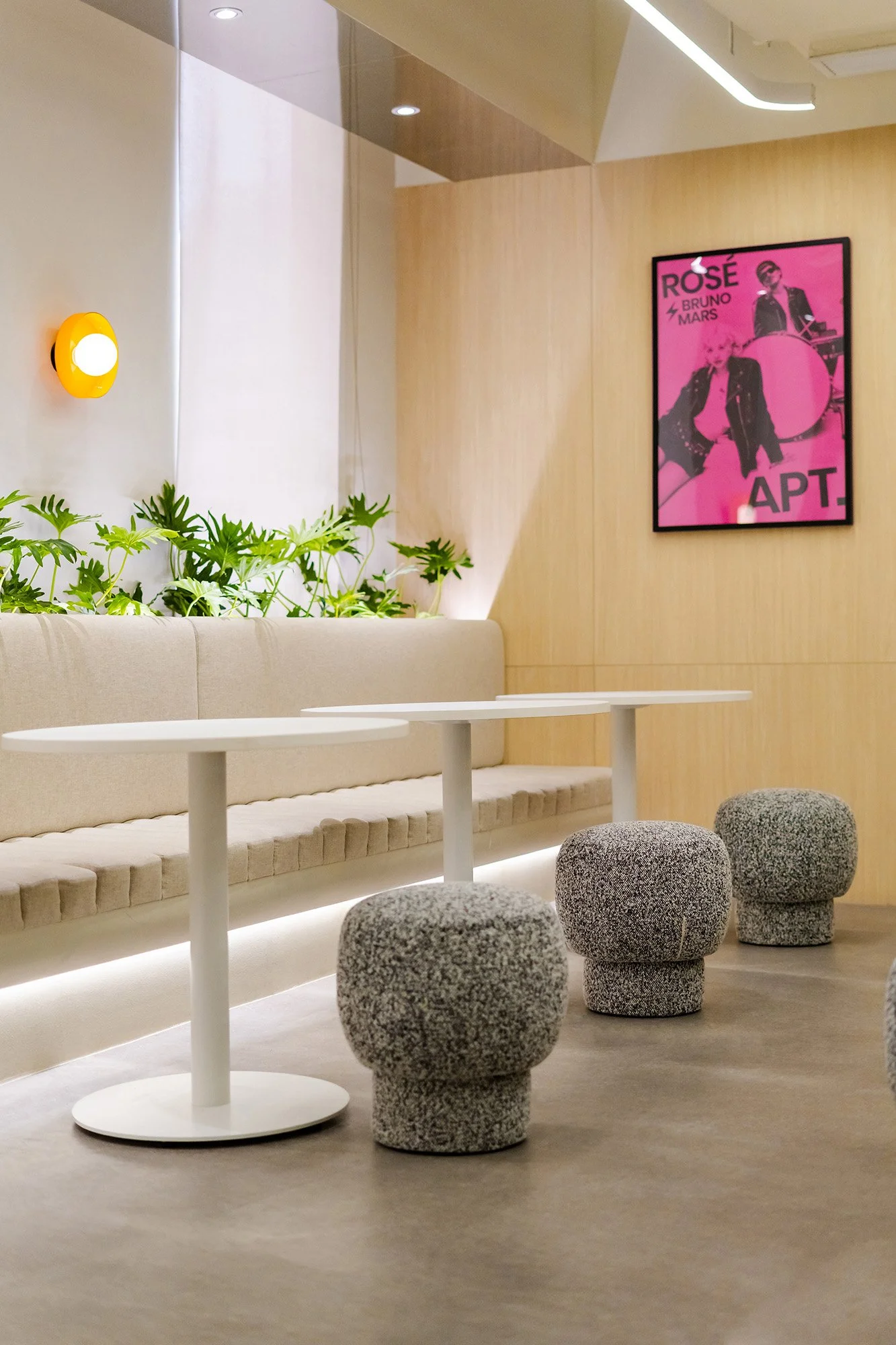 Our design process explored how the global identity of Warner Music could be expressed through local storytelling. We developed bespoke joinery that subtly echoes the brand’s pill-like geometry, from the curved seating niches to select lighting features. The artist room is hidden behind the performance stage with a concealed door, allowing performers to step directly onto the stage.. Close collaboration with both the global and local Warner Music teams was essential—from aligning the design with international workplace standards to embedding cultural nuances unique to the Philippines.