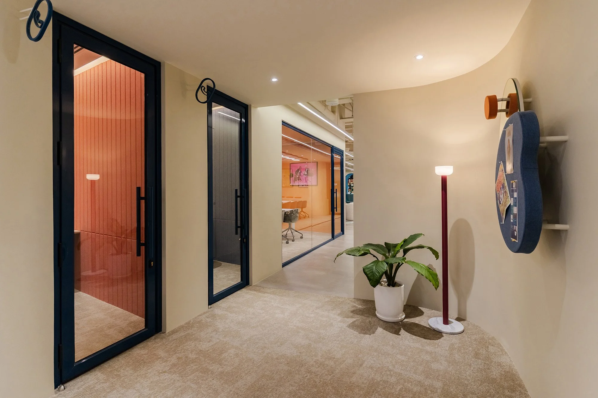 Acoustics were carefully engineered: enhanced partitions for meeting rooms and music spaces, acoustic ceiling treatments, and calibrated sound absorption within wall panels. The open plan intentionally retains a gentle sociable buzz while ensuring clarity during calls and focused work.