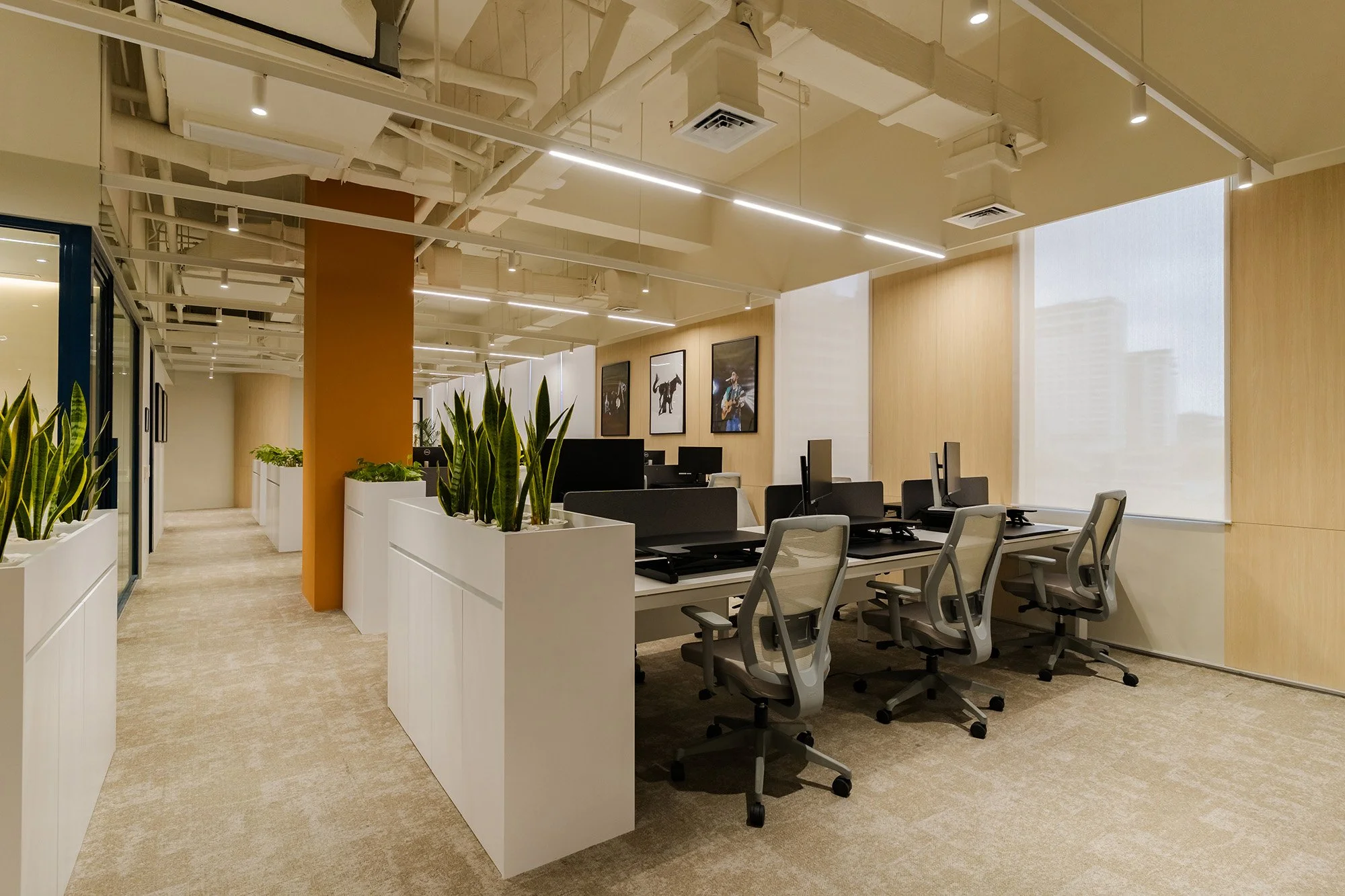 The open-plan area uses energy-efficient LEDs with excellent colour rendering, supporting long hours of work. Task lighting is calibrated to reduce visual fatigue, while ambient lighting ensures a welcoming environment across the day.