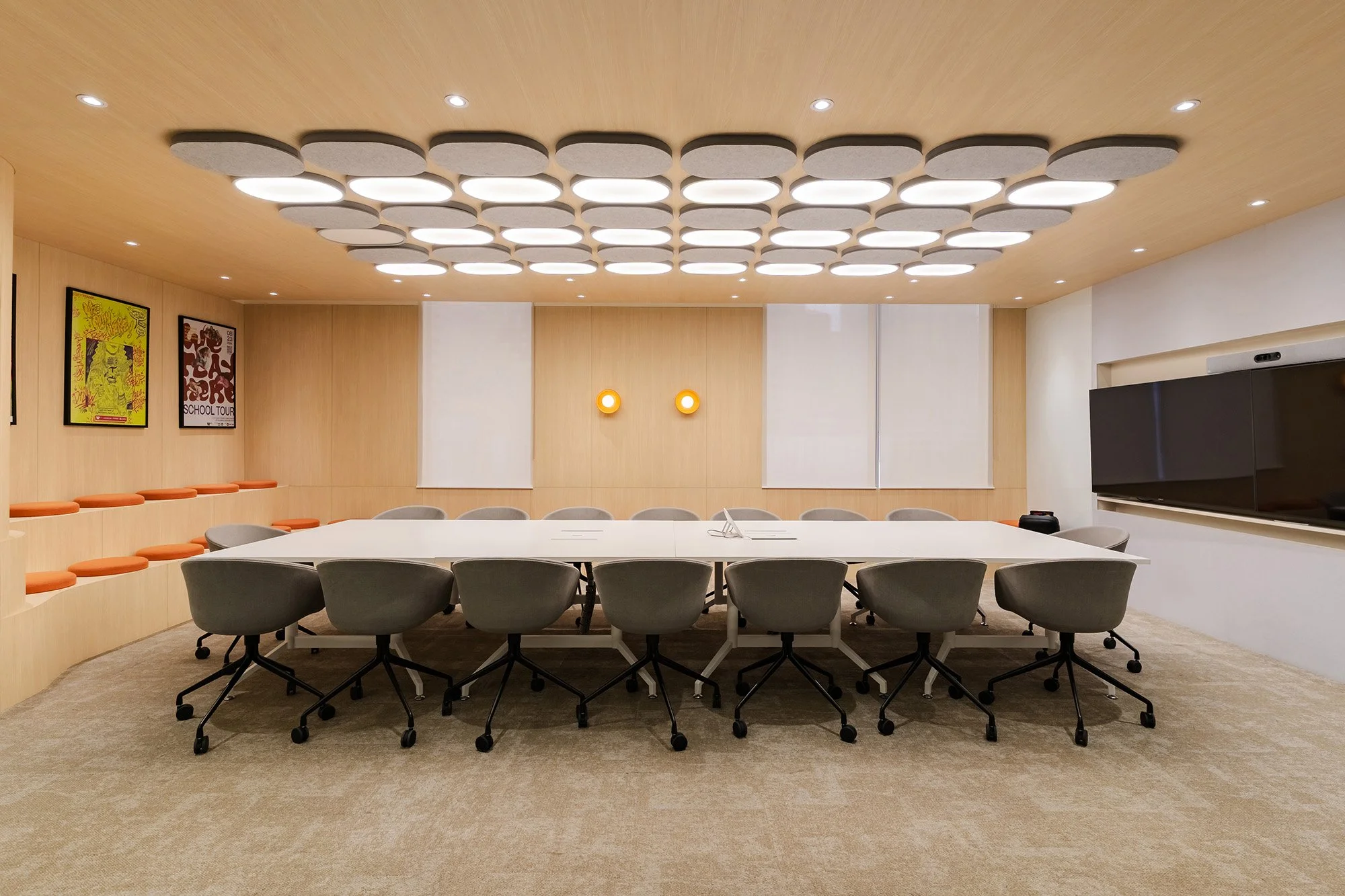 Lighting plays across several layers to balance energy with comfort. The front-of-house features diagonally arranged linear LEDs that echo the movement of sound waves, animating the open ceiling during events while remaining dimmable for a softer daytime ambience. The boardroom’s illuminated timber light boxes provide a warm architectural glow, and indirect lighting in niches and transitions encourages a sense of ease throughout the workspace.